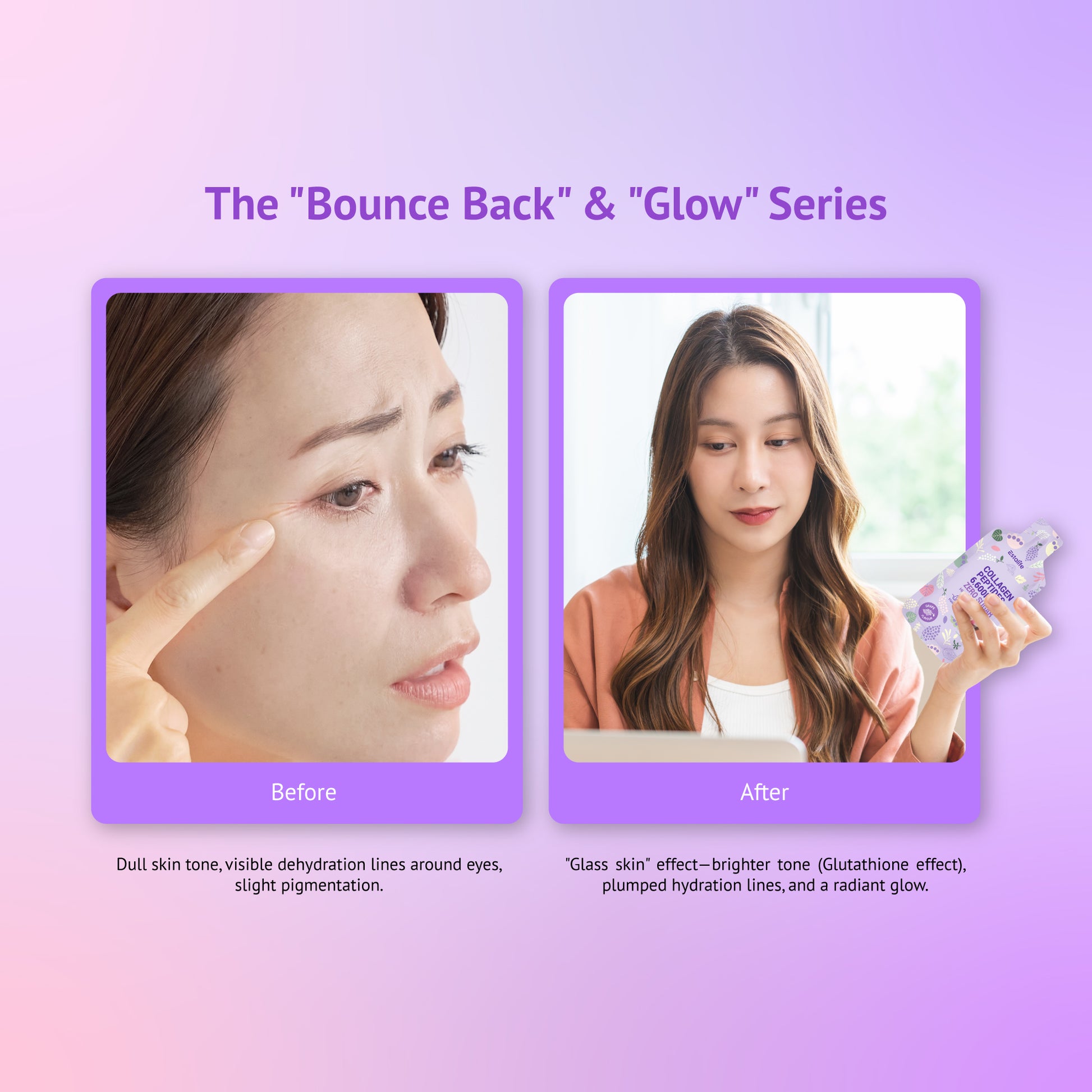 "Glass skin" effect—brighter tone (Glutathione effect), plumped hydration lines, and a radiant glow.