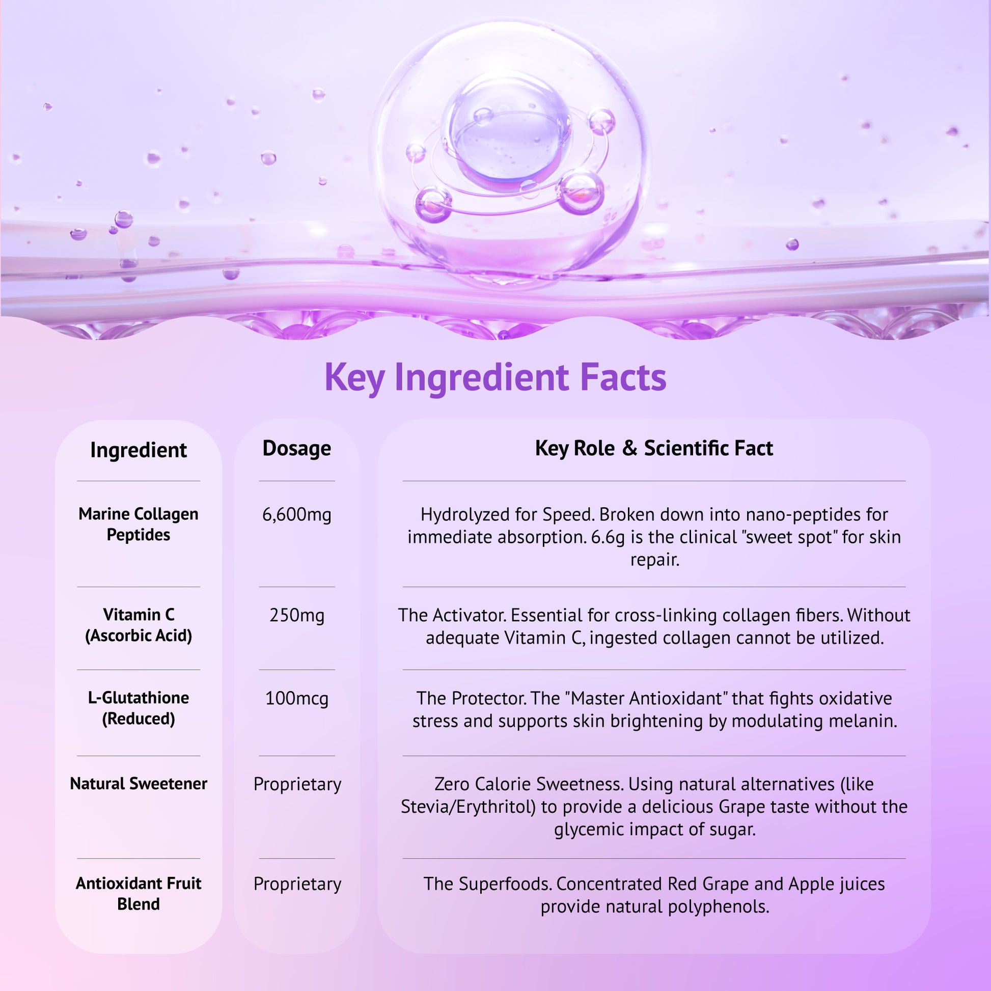 | Marine Collagen Peptides | Hydrolyzed for Speed. Broken down into nano-peptides for immediate absorption. 6.6g is the clinical "sweet spot" for skin repair. | 6,600mg |