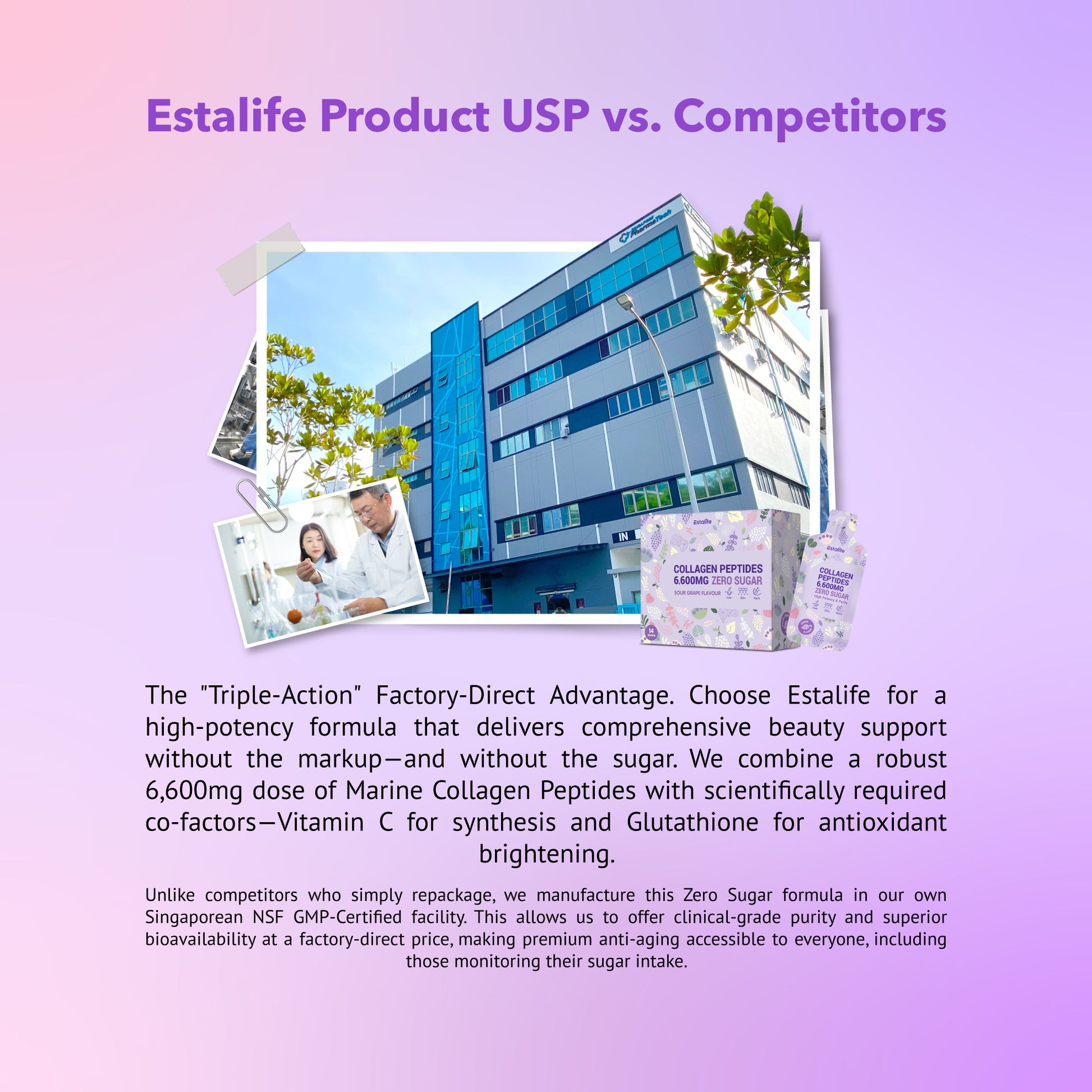The "Triple-Action" Factory-Direct Advantage. Choose Estalife for a high-potency formula that delivers comprehensive beauty support without the markup—and without the sugar. We combine a robust 6,600mg dose of Marine Collagen Peptides with scientifically required co-factors—Vitamin C for synthesis and Glutathione for antioxidant brightening.