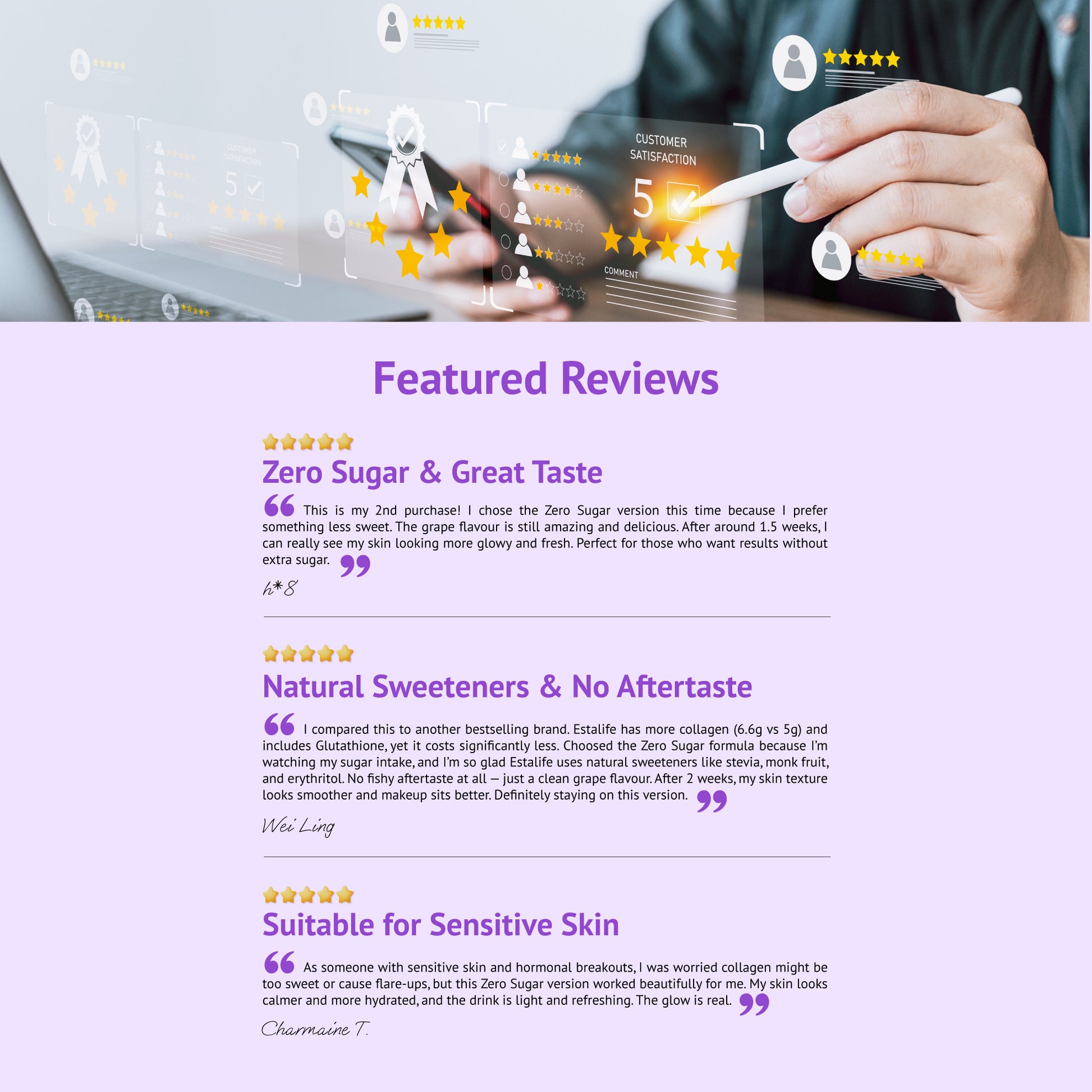 "I compared this to another bestselling brand. Estalife has more collagen (6.6g vs 5g) and includes Glutathione, yet it costs significantly less. Choosed the Zero Sugar formula because I’m watching my sugar intake, and I’m so glad Estalife uses natural sweeteners like stevia, monk fruit, and erythritol. No fishy aftertaste at all — just a clean grape flavour. After 2 weeks, my skin texture looks smoother and makeup sits better. Definitely staying on this version."