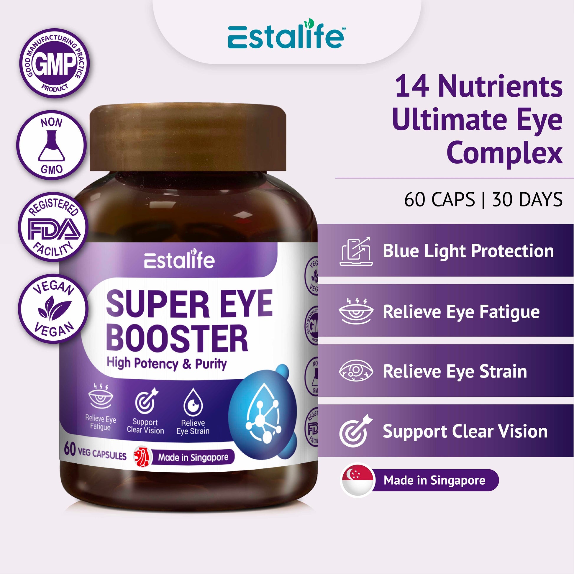 The Scientific Explanation: Estalife® Super Eye Booster is a high-potency, 14-in-1 ocular support matrix. It delivers a massive 40mg of Lutein and 8mg of Zeaxanthin to rapidly increase Macular Pigment Optical Density (MPOD)—your eye's natural blue-light filter. It integrates an AREDS2-inspired core (Vitamin C, E, Zinc, Copper) with cellular protectors like L-Taurine (highly concentrated in the retina) and CoQ10 / L-Glutathione to reduce oxidative stress and defend photoreceptors from high-energy visible (HEV) light.