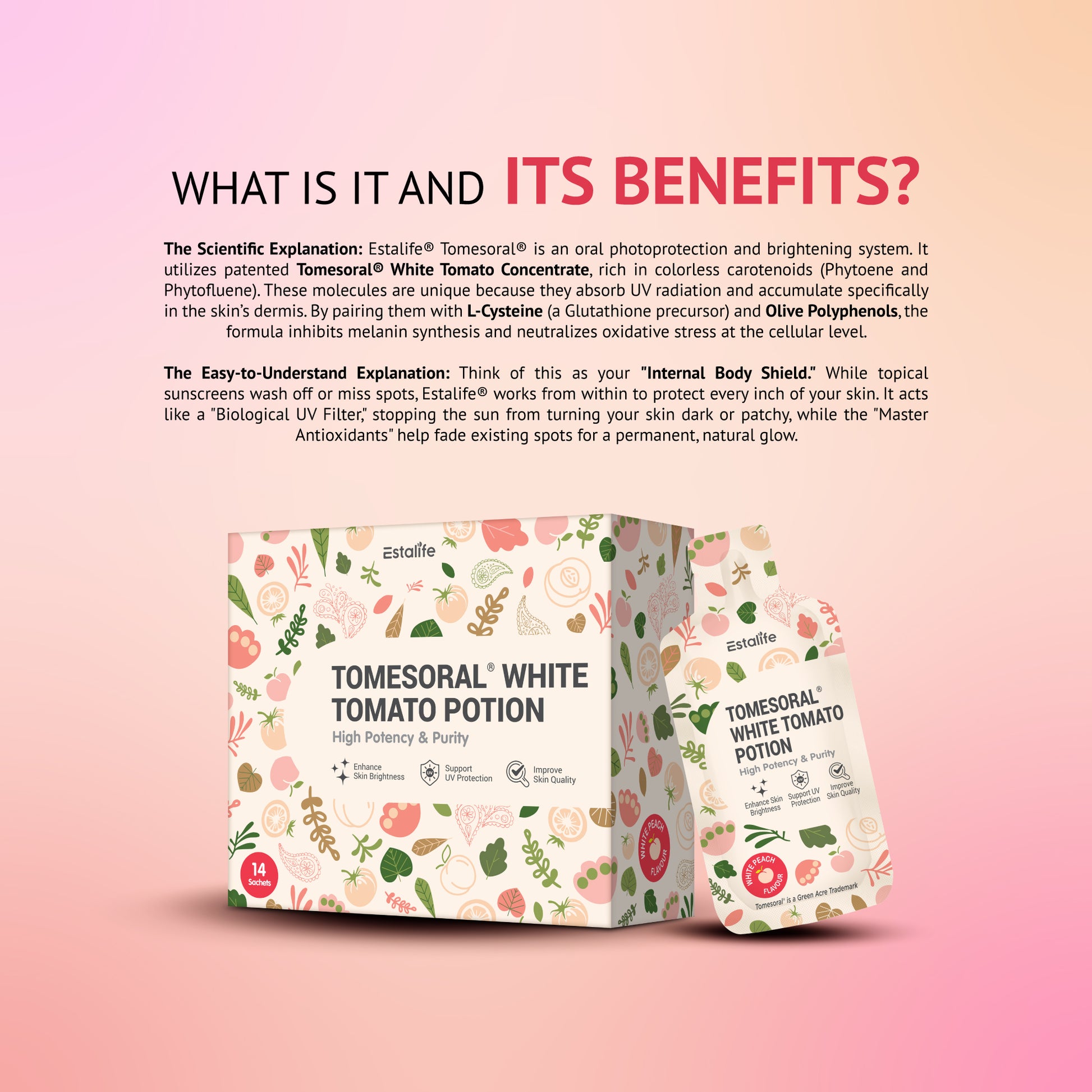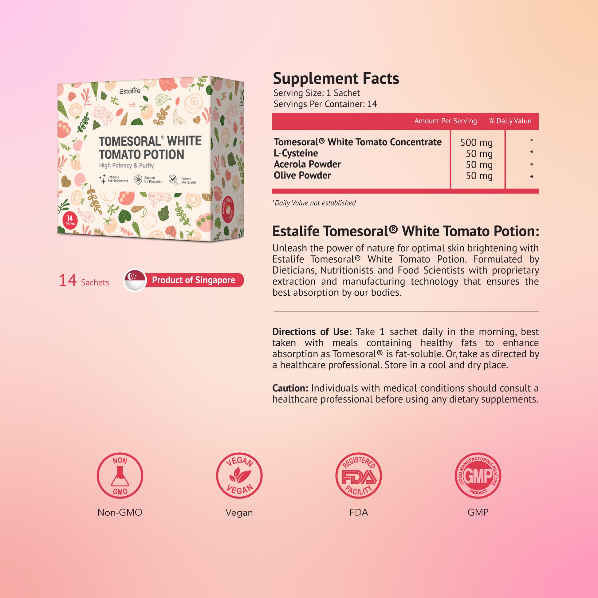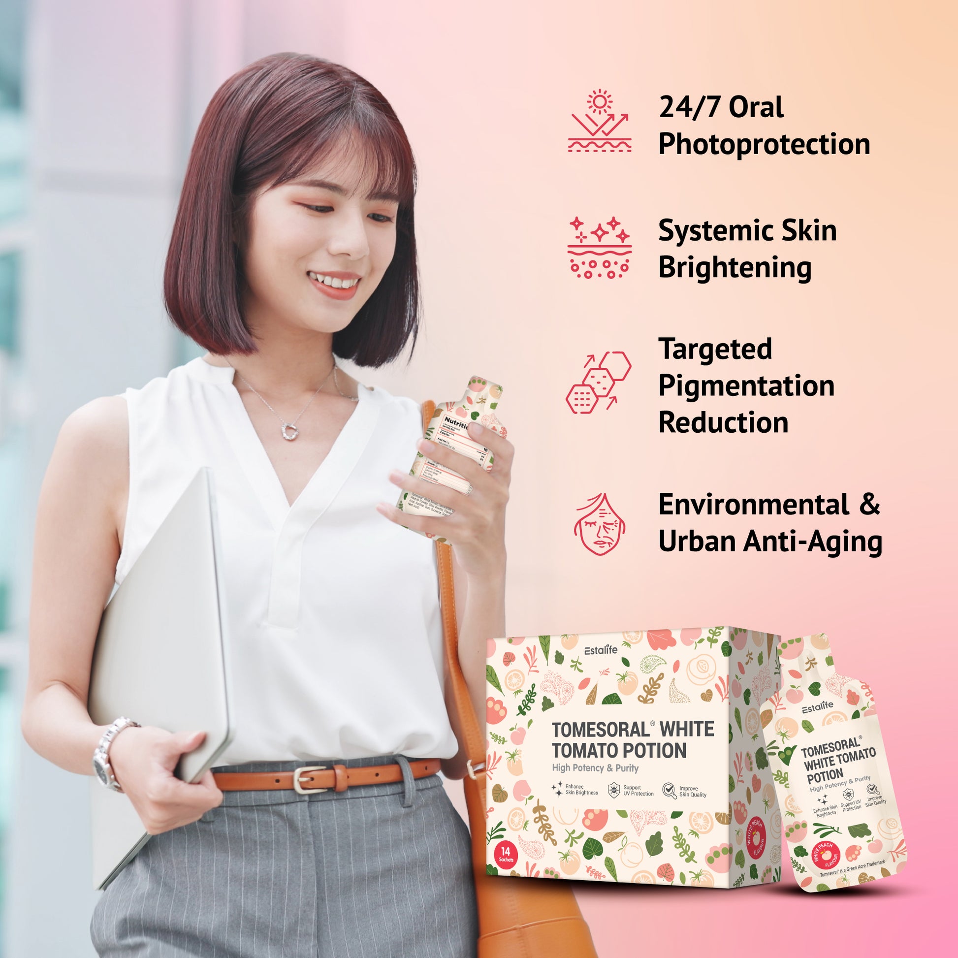Unleash the power of nature for optimal skin brightening with Estalife Tomesoral® White Tomato Potion. Formulated by Dieticians, Nutritionists and Food Scientists with proprietary extraction and manufacturing technology that ensures the best absorption by our bodies.