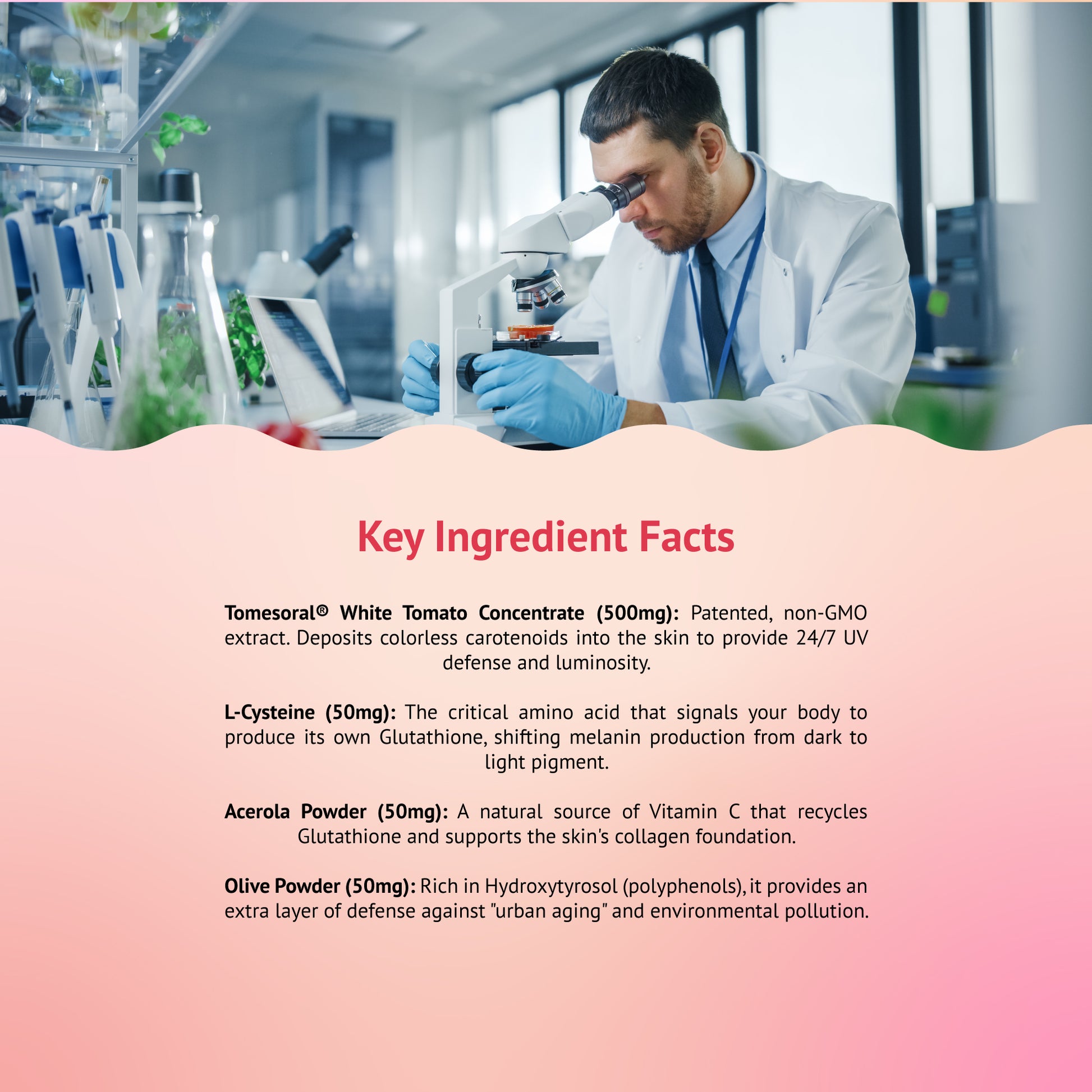 Tomesoral® White Tomato Concentrate (500mg): Patented, non-GMO extract. Deposits colorless carotenoids into the skin to provide 24/7 UV defense and luminosity.