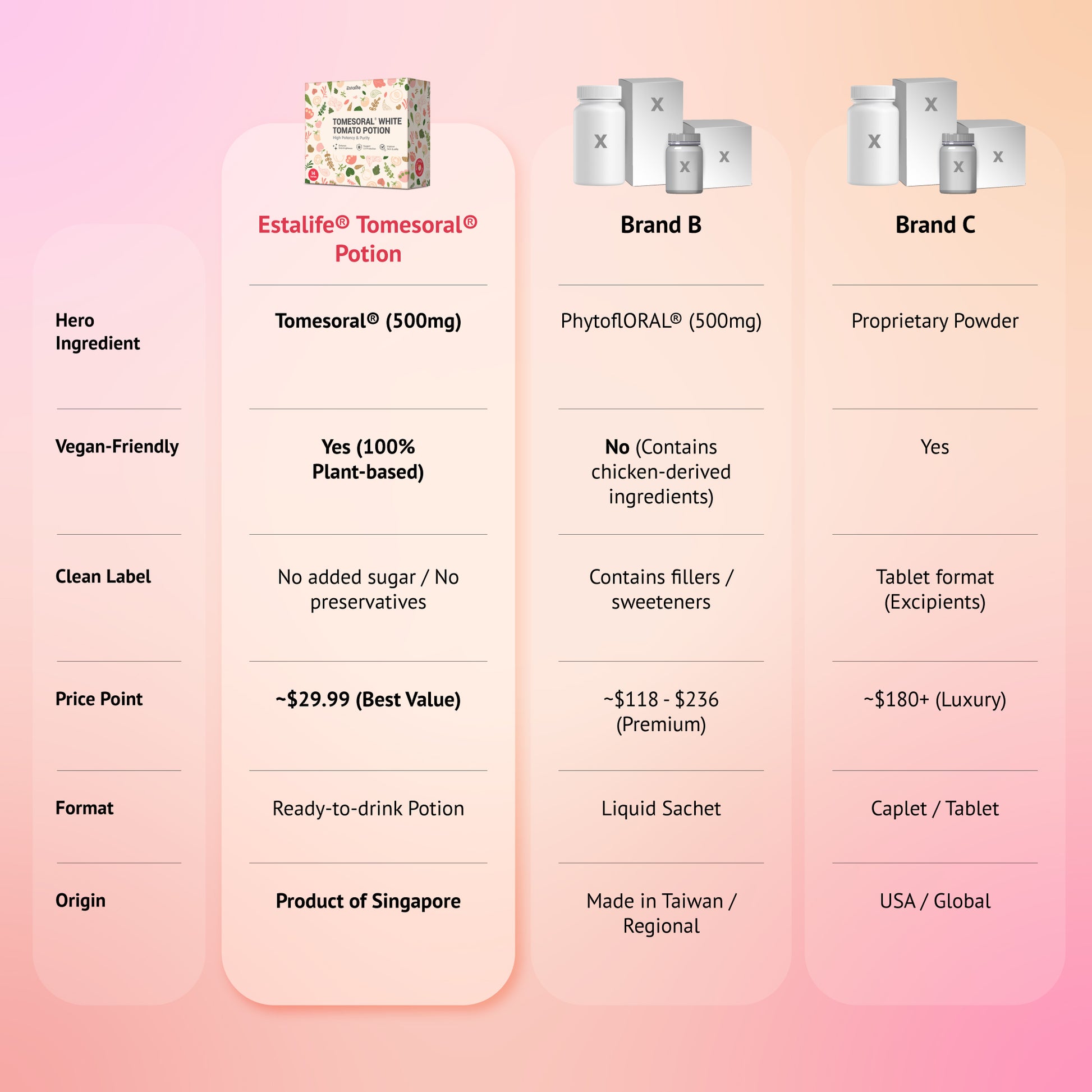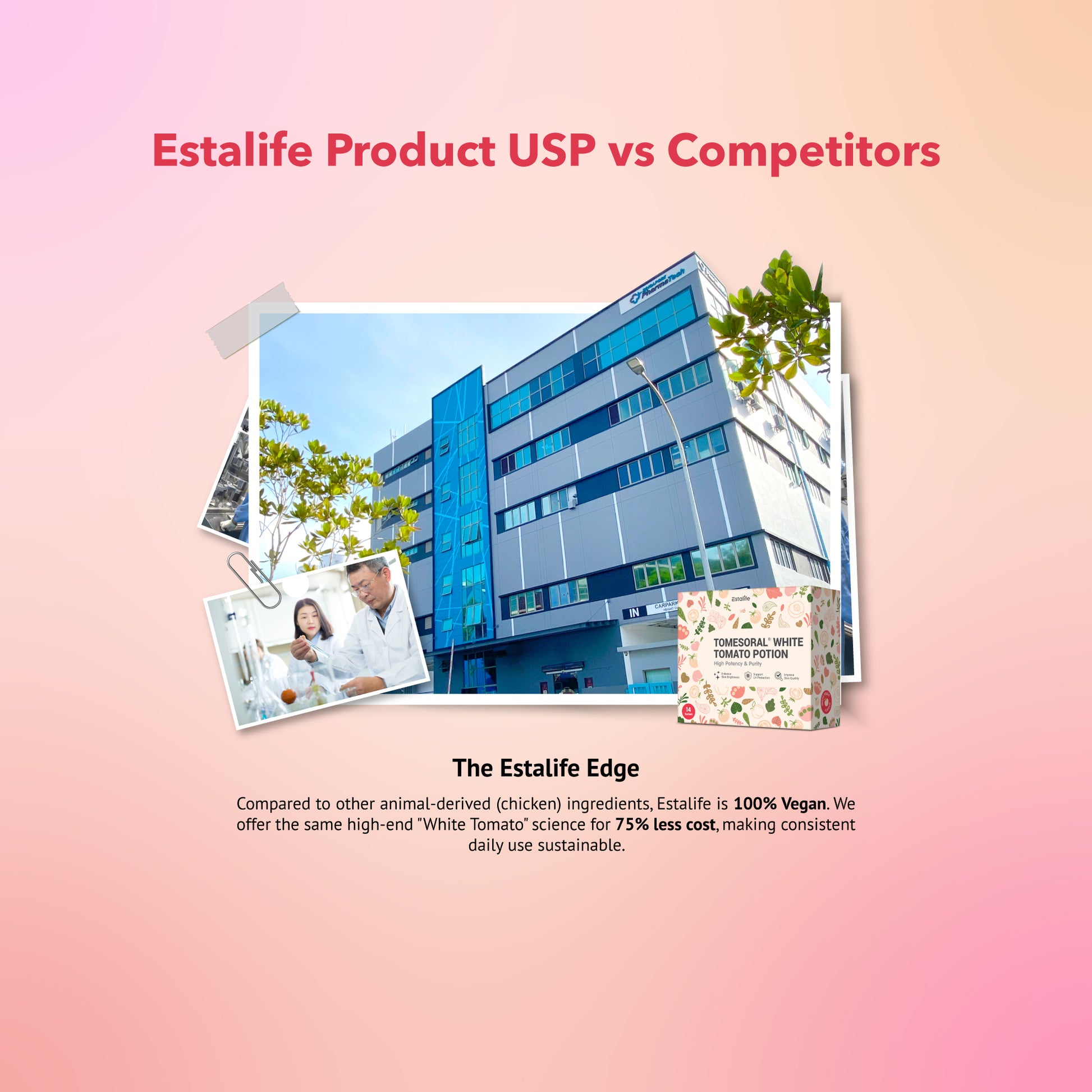 Compared to other animal-derived (chicken) ingredients, Estalife is 100% Vegan. We offer the same high-end "White Tomato" science for 75% less cost, making consistent daily use sustainable.