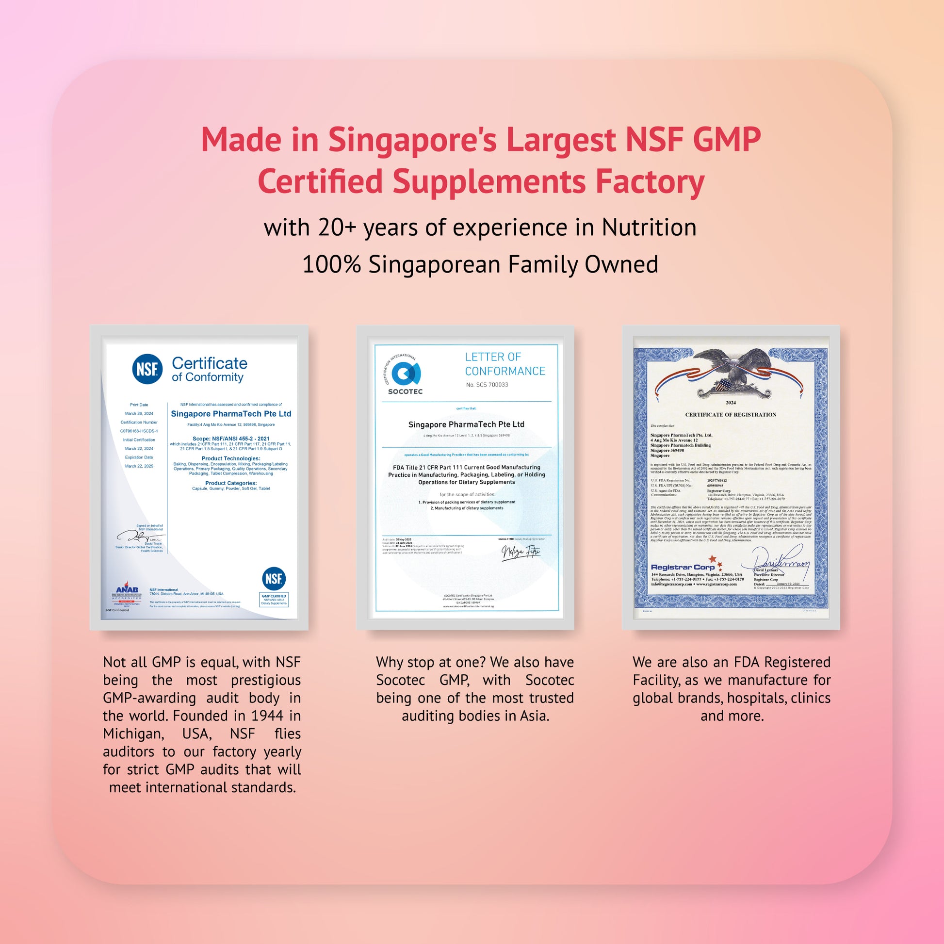Made in our 100% Singaporean-owned facility. By cutting out the middleman, we deliver premium, clinical-grade supplements directly from our lab to your door at an affordable price.