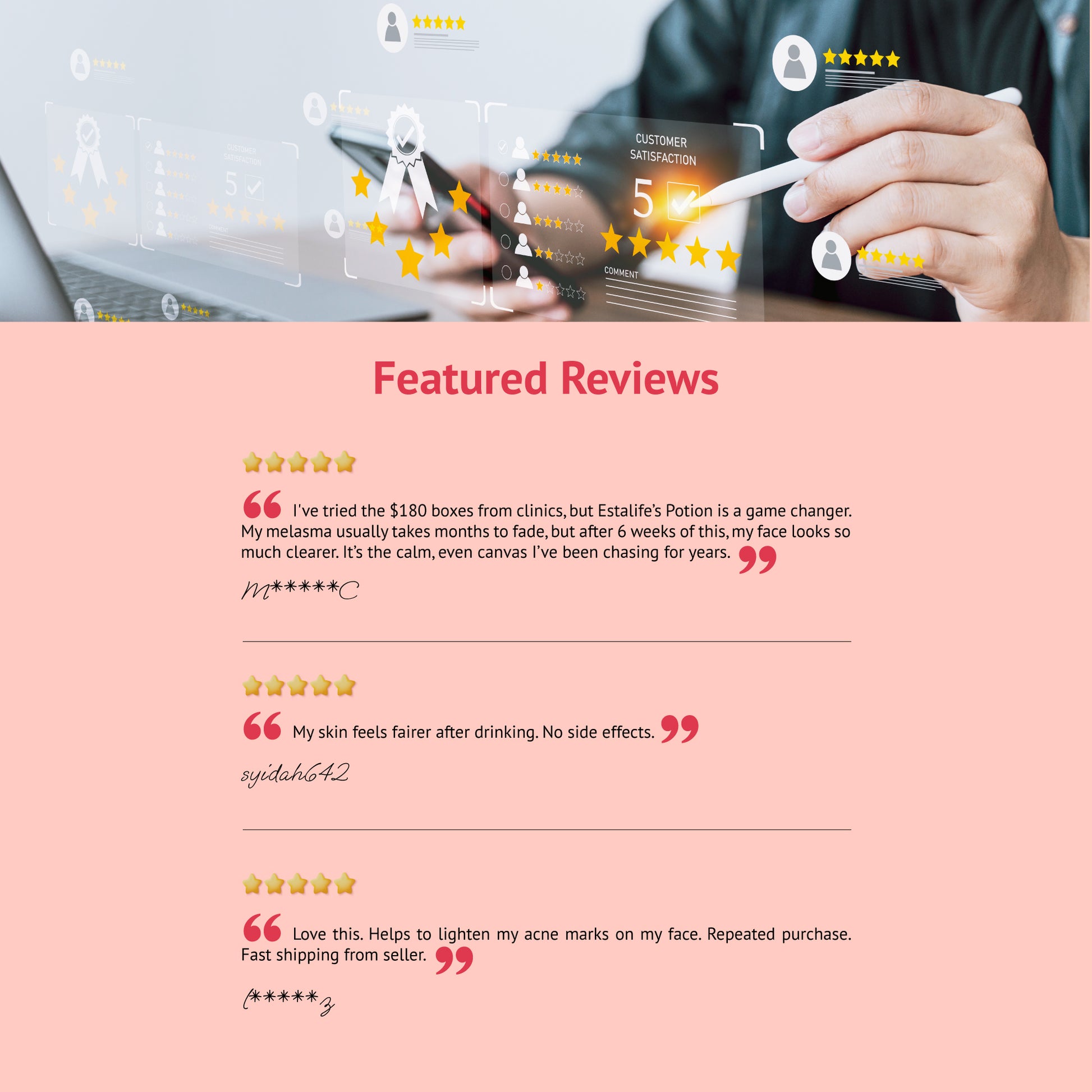 "I've tried the $180 boxes from clinics, but Estalife’s Potion is a game changer. My melasma usually takes months to fade, but after 6 weeks of this, my face looks so much clearer. It’s the calm, even canvas I’ve been chasing for years."