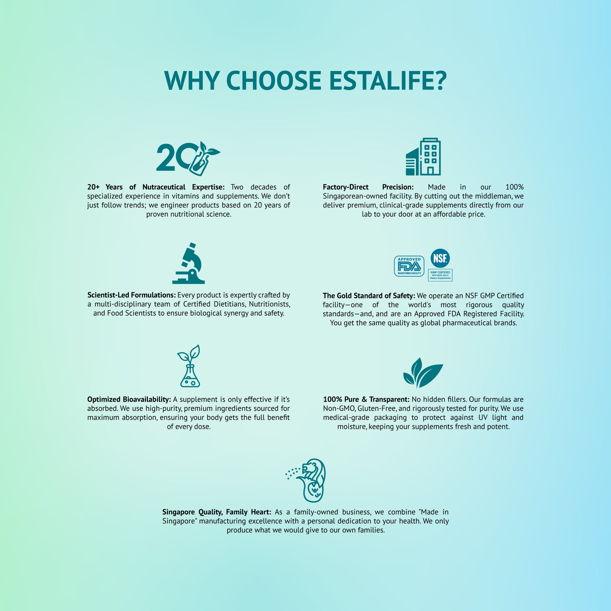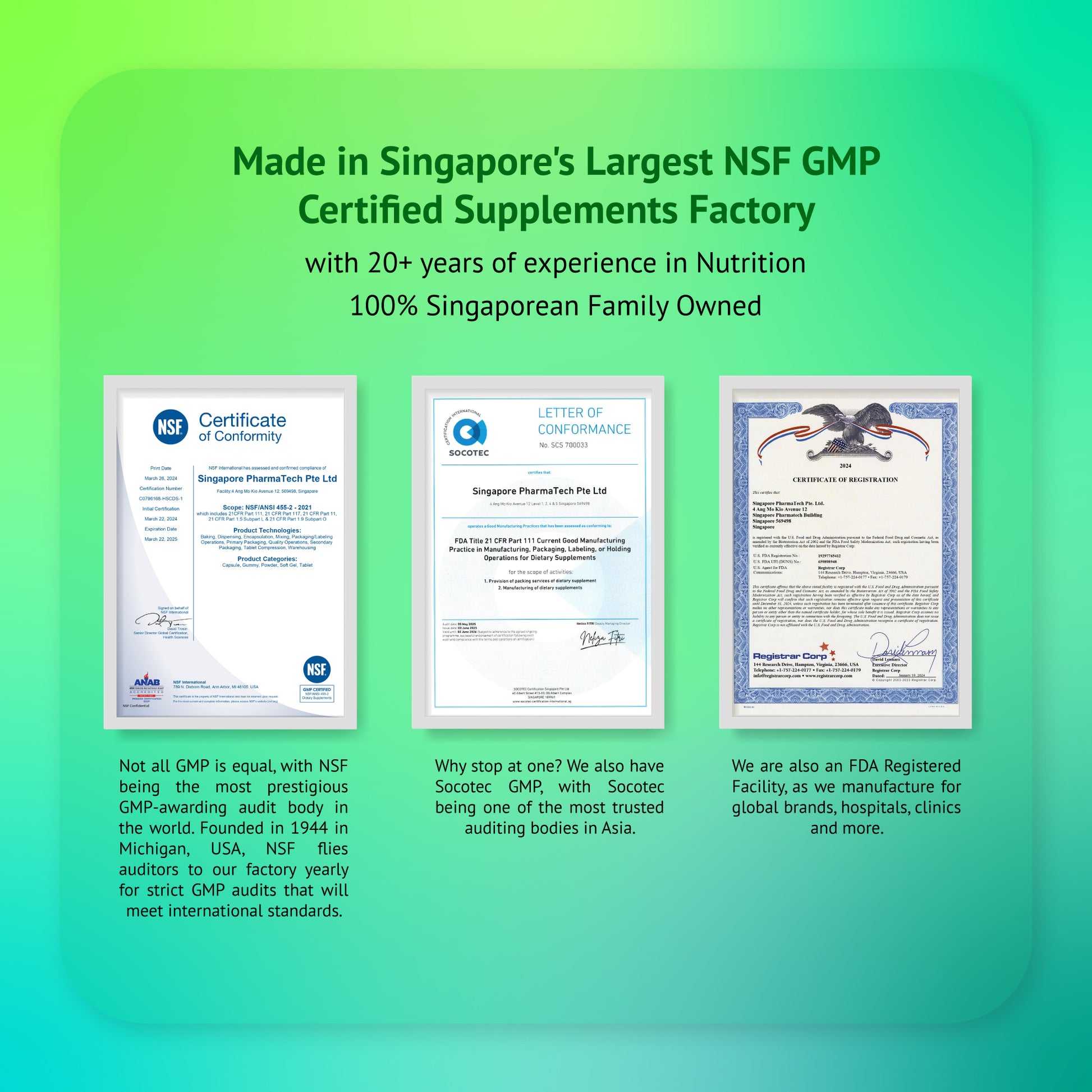 As a family-owned business, we combine "Made in Singapore" manufacturing excellence with a personal dedication to your health. We only produce what we would give to our own families.