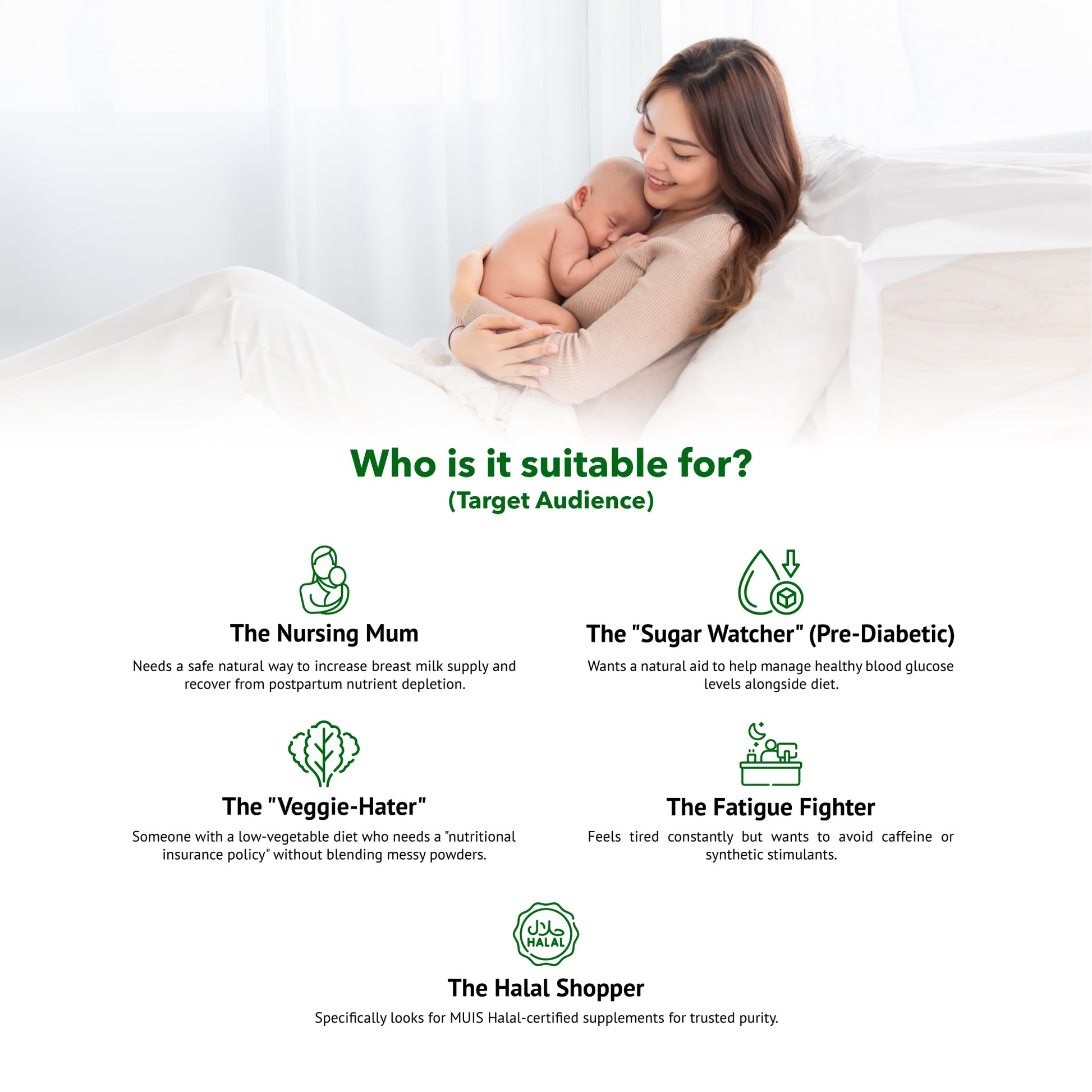 Specifically looks for MUIS Halal-certified supplements for trusted purity.