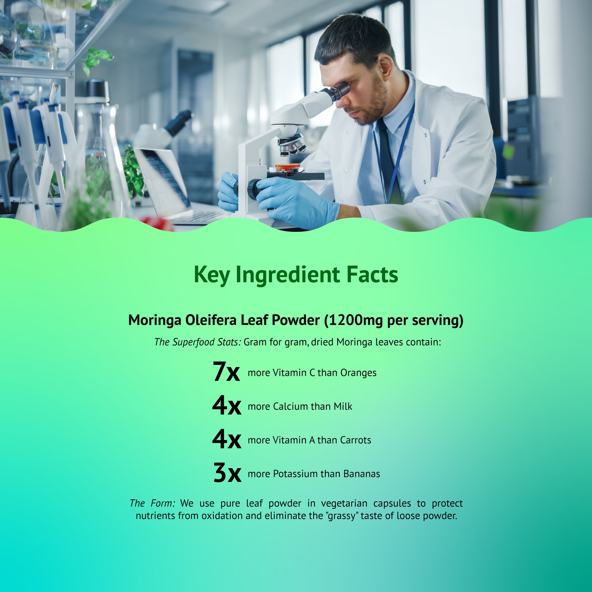 The Form: We use pure leaf powder in vegetarian capsules to protect nutrients from oxidation and eliminate the "grassy" taste of loose powder.