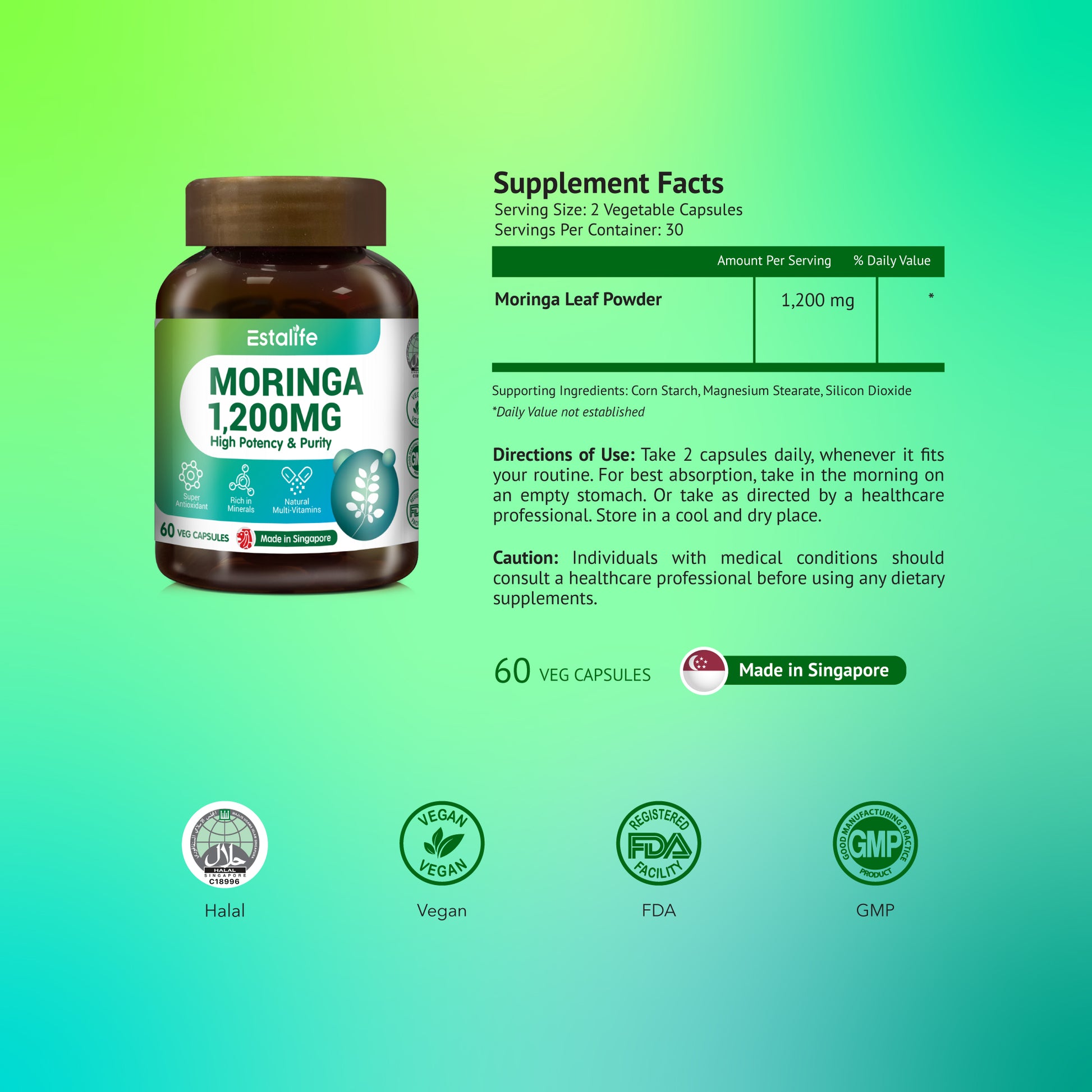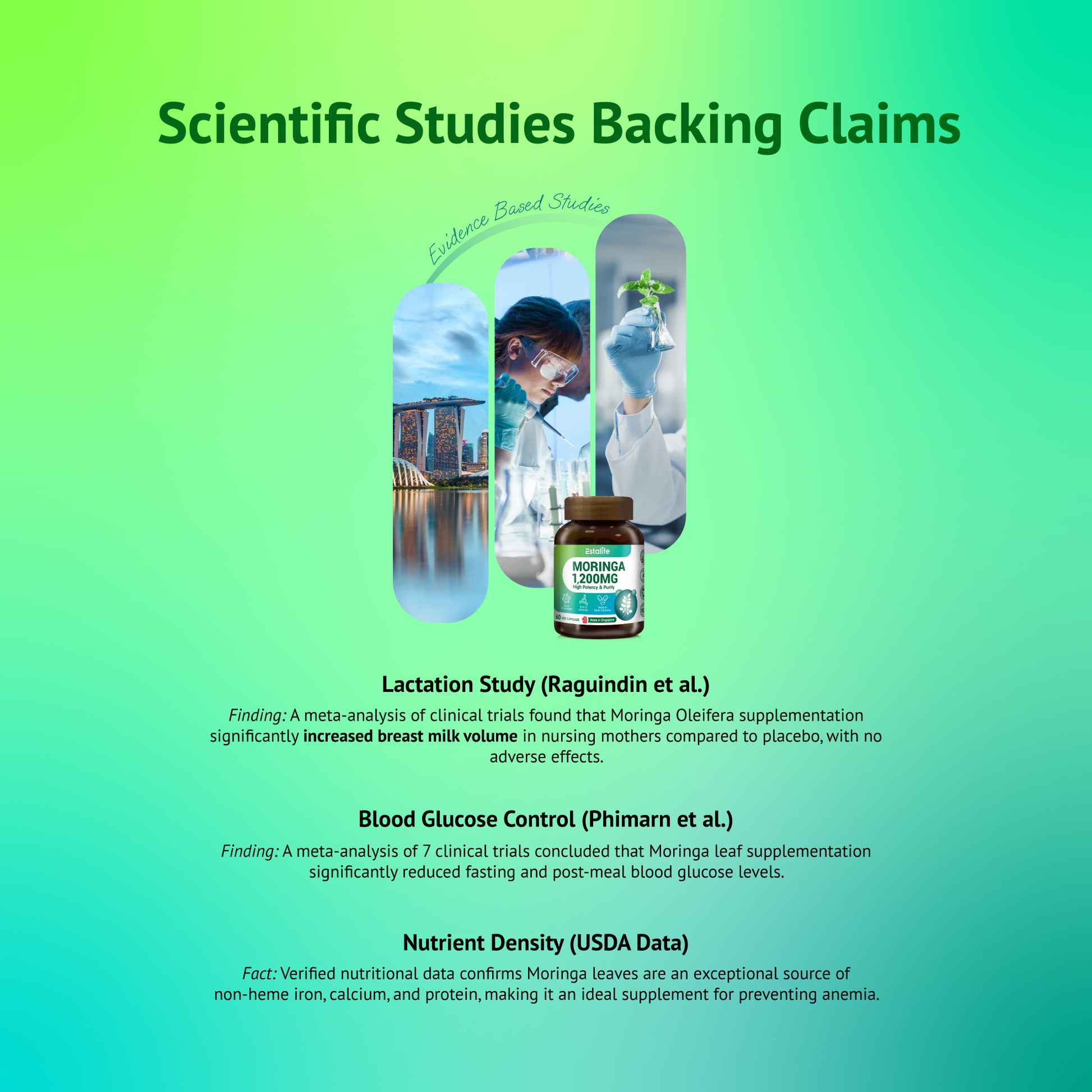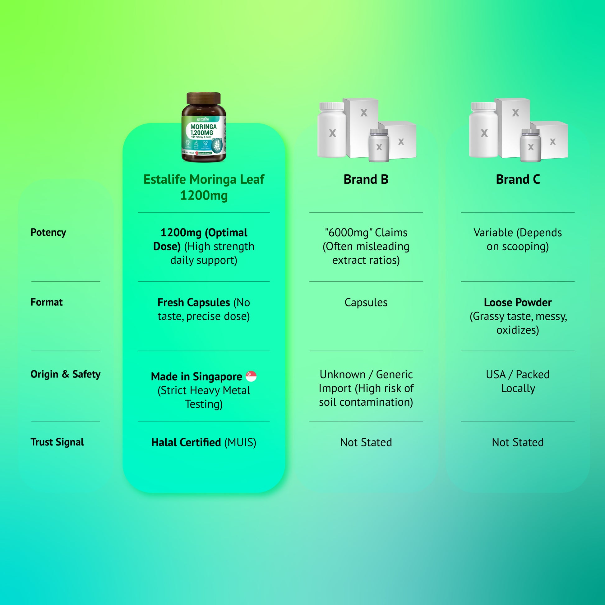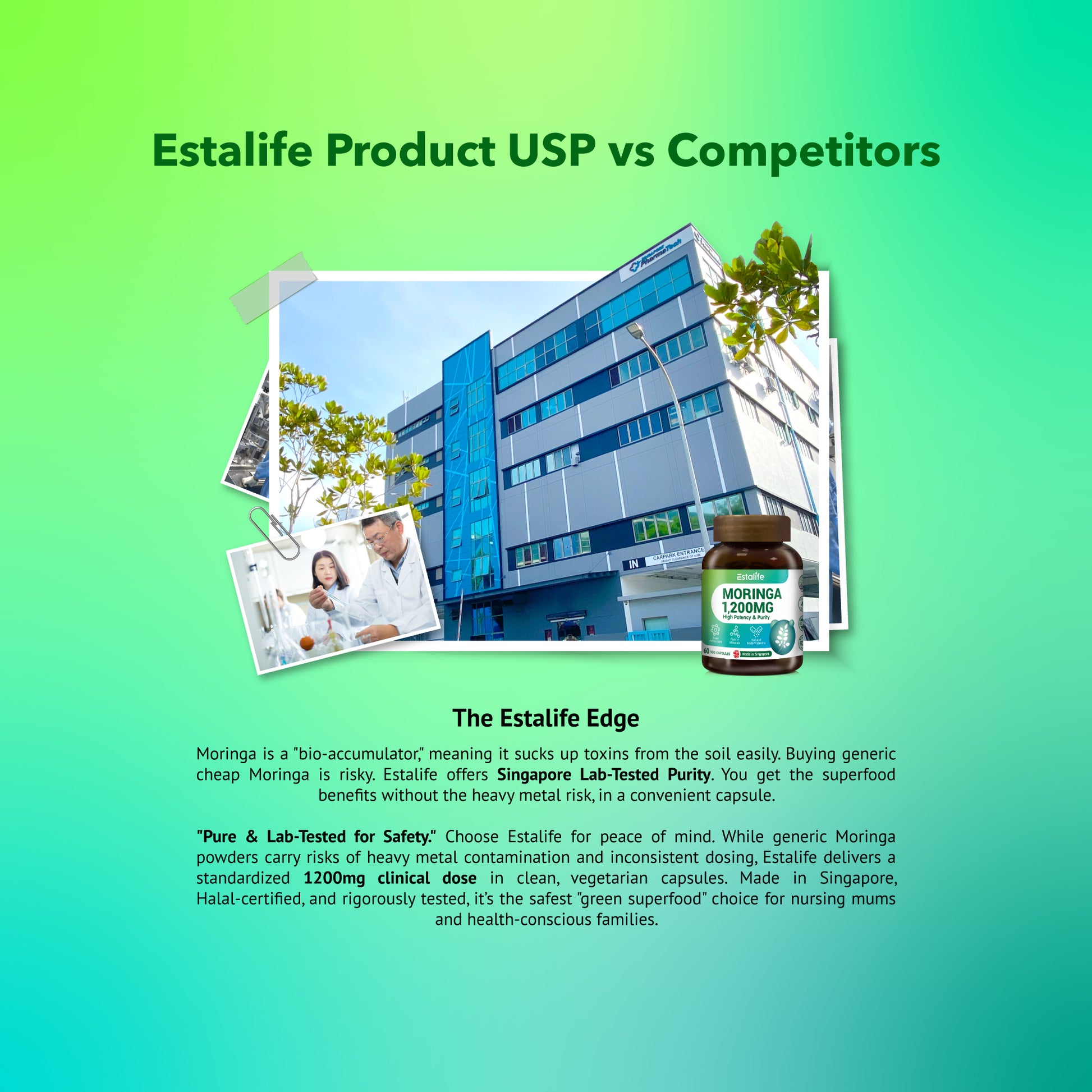 "Pure & Lab-Tested for Safety." Choose Estalife for peace of mind. While generic Moringa powders carry risks of heavy metal contamination and inconsistent dosing, Estalife delivers a standardized 1200mg clinical dose in clean, vegetarian capsules. Made in Singapore, Halal-certified, and rigorously tested, it’s the safest "green superfood" choice for nursing mums and health-conscious families.