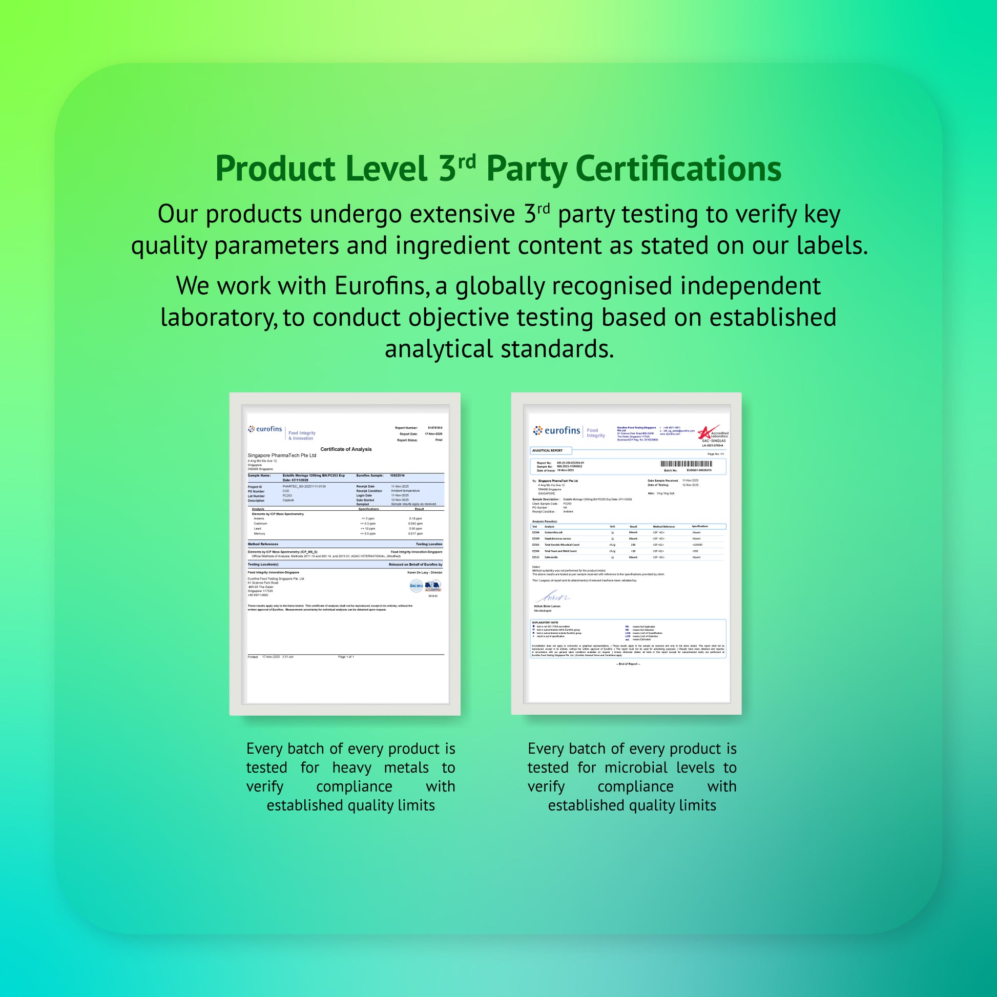 We work with Eurofins, a globally recognised independent laboratory, to conduct objective testing based on established analytical standards.