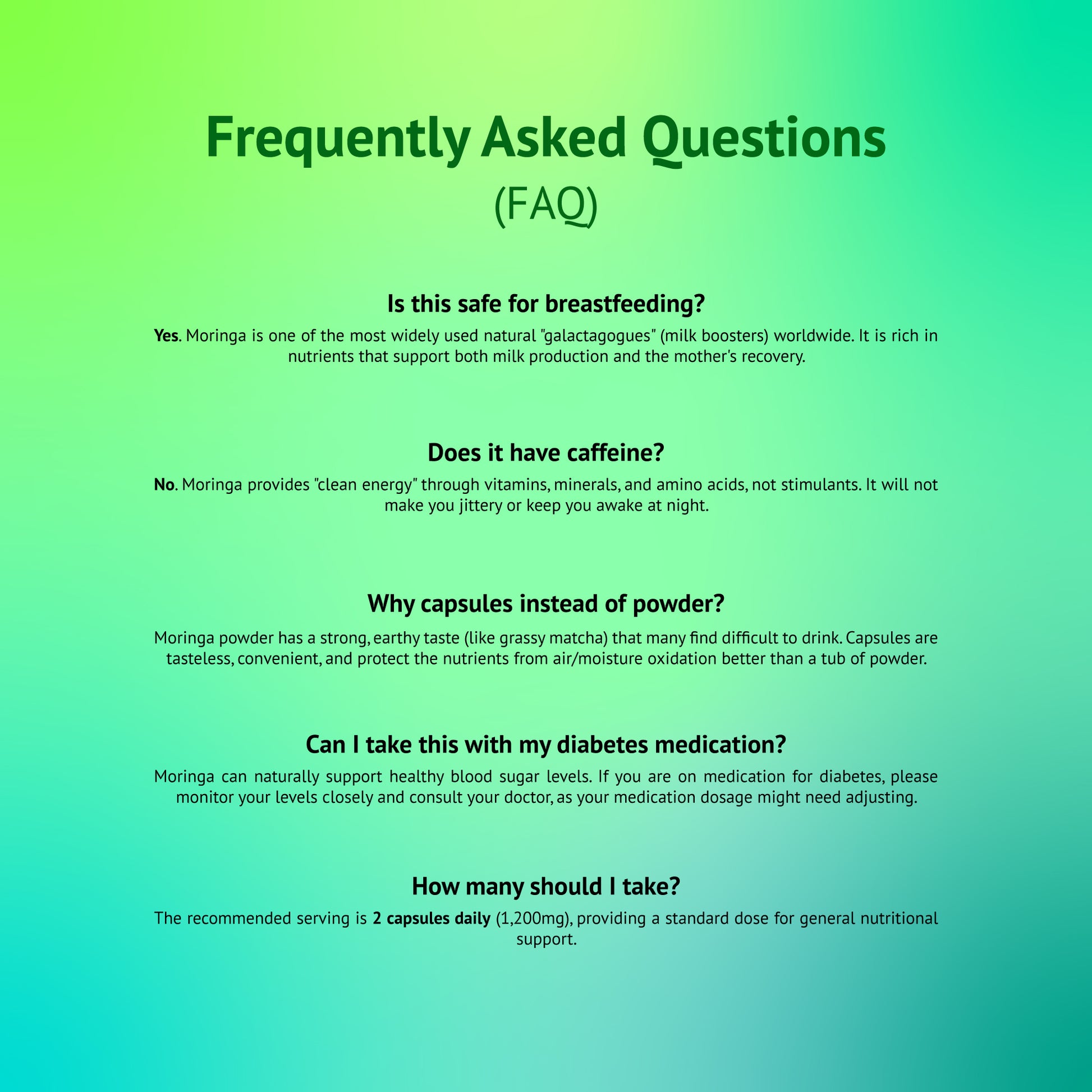 Moringa powder has a strong, earthy taste (like grassy matcha) that many find difficult to drink. Capsules are tasteless, convenient, and protect the nutrients from air/moisture oxidation better than a tub of powder.
