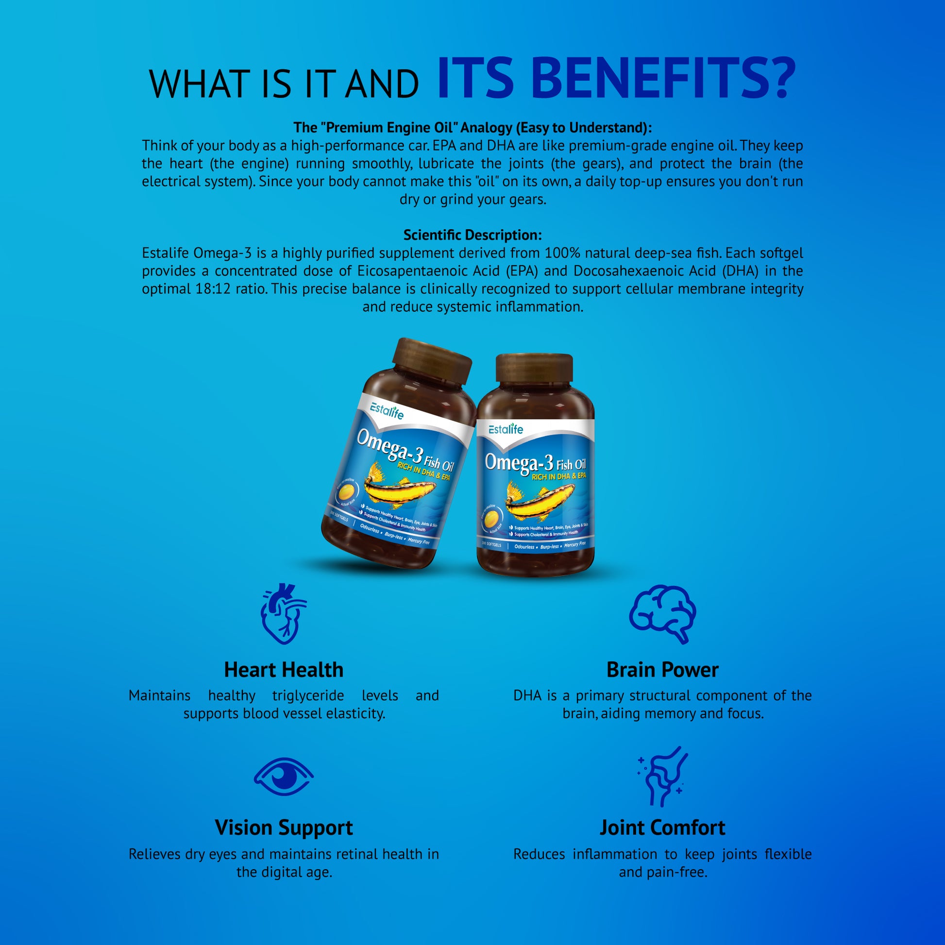 Choose Estalife for a smarter, cleaner Omega-3 experience. While other brands offer massive "horse pills" that smell fishy and cause unpleasant burps, Estalife delivers high-quality Deep Sea Fish Oil in XS Easy-to-Swallow Softgels. Crafted in Singapore with a commitment to purity, our formula provides the golden ratio of essential EPA and DHA to support your heart, brain, and joints—without the hassle, the size, or the smell.