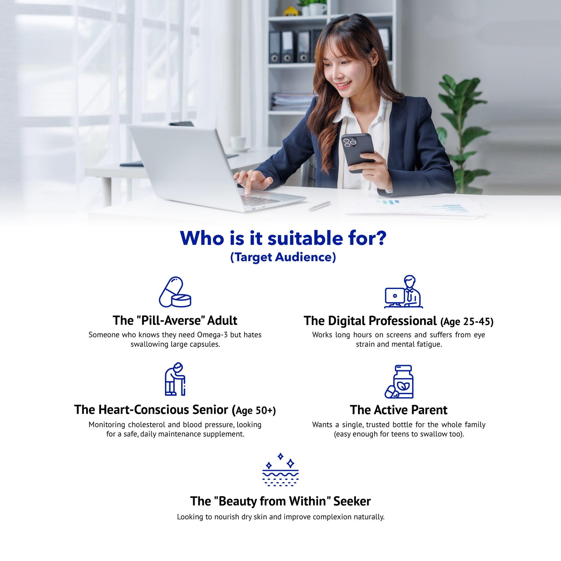 "Fast delivery and well-packed. I’ve tried different omega-3 brands before, but this one stands out because of how gentle it is — no bloating, no aftertaste, no smell. The softgels are so small that even my elderly mum can take them comfortably. After finishing one bottle, her joints feel less stiff and she says her eyes feel less dry after long hours on the phone. Already repurchased."