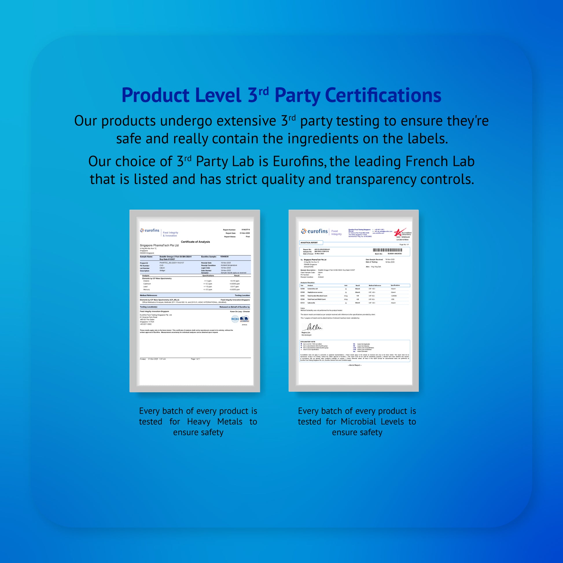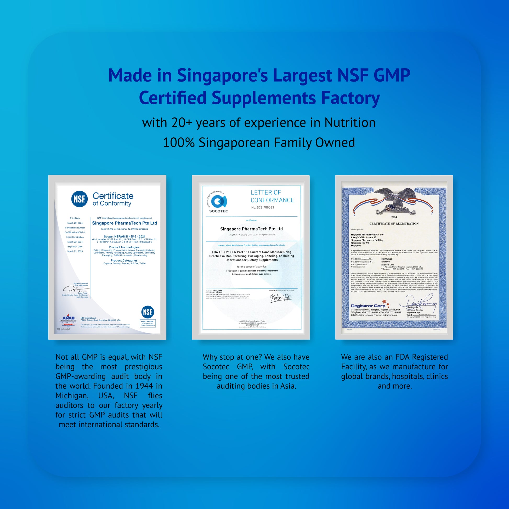 Made in our 100% Singaporean-owned facility. By cutting out the middleman, we deliver premium, clinical-grade supplements directly from our lab to your door at an affordable price.