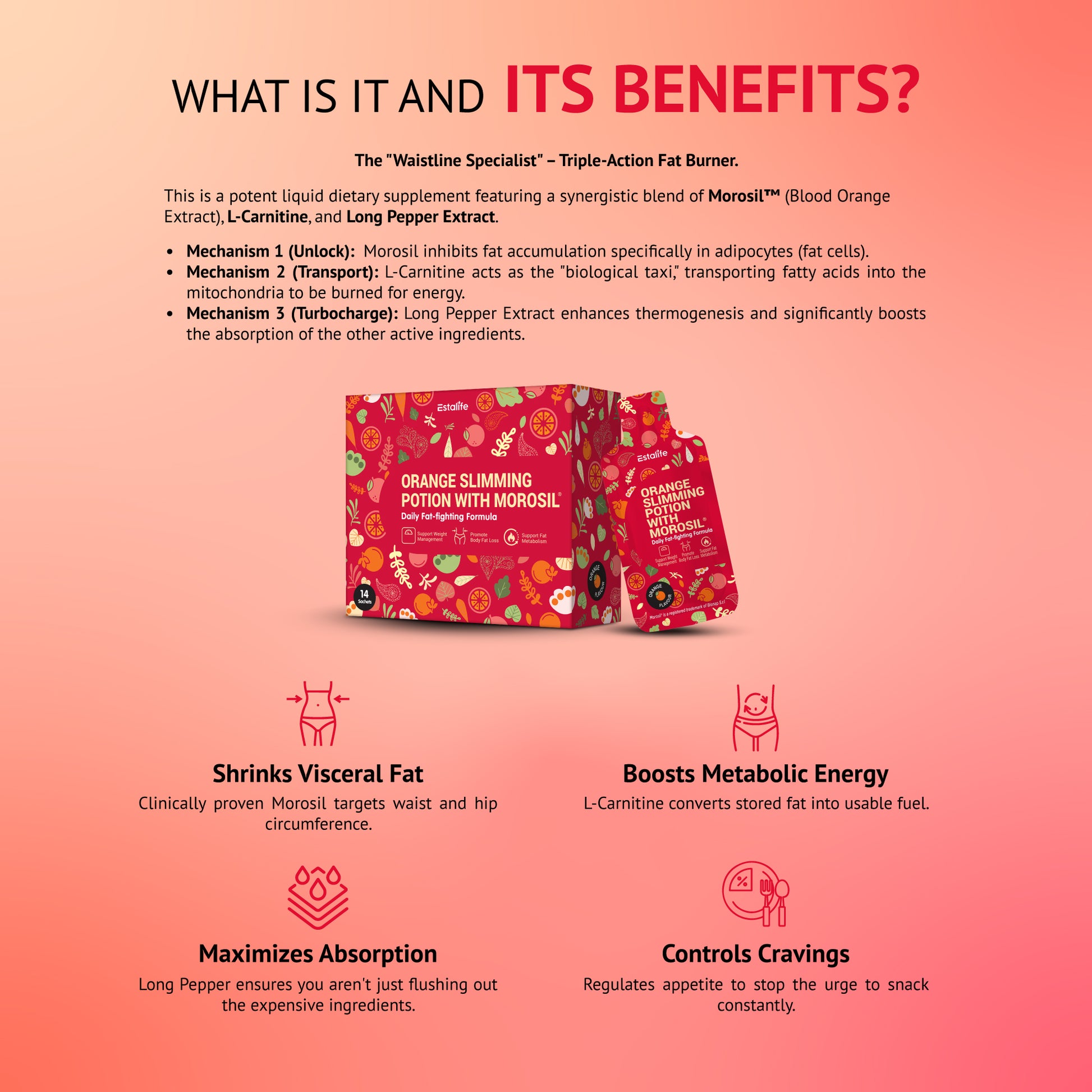 由营养师和营养学家配制的日常伴侣,旨在支持新陈代谢、腰围管理和整体健康。 采用经临床研究的Morosil®血橙提取物,结合左旋肉碱和长胡椒提取物,以增强吸收和效果。 🌟