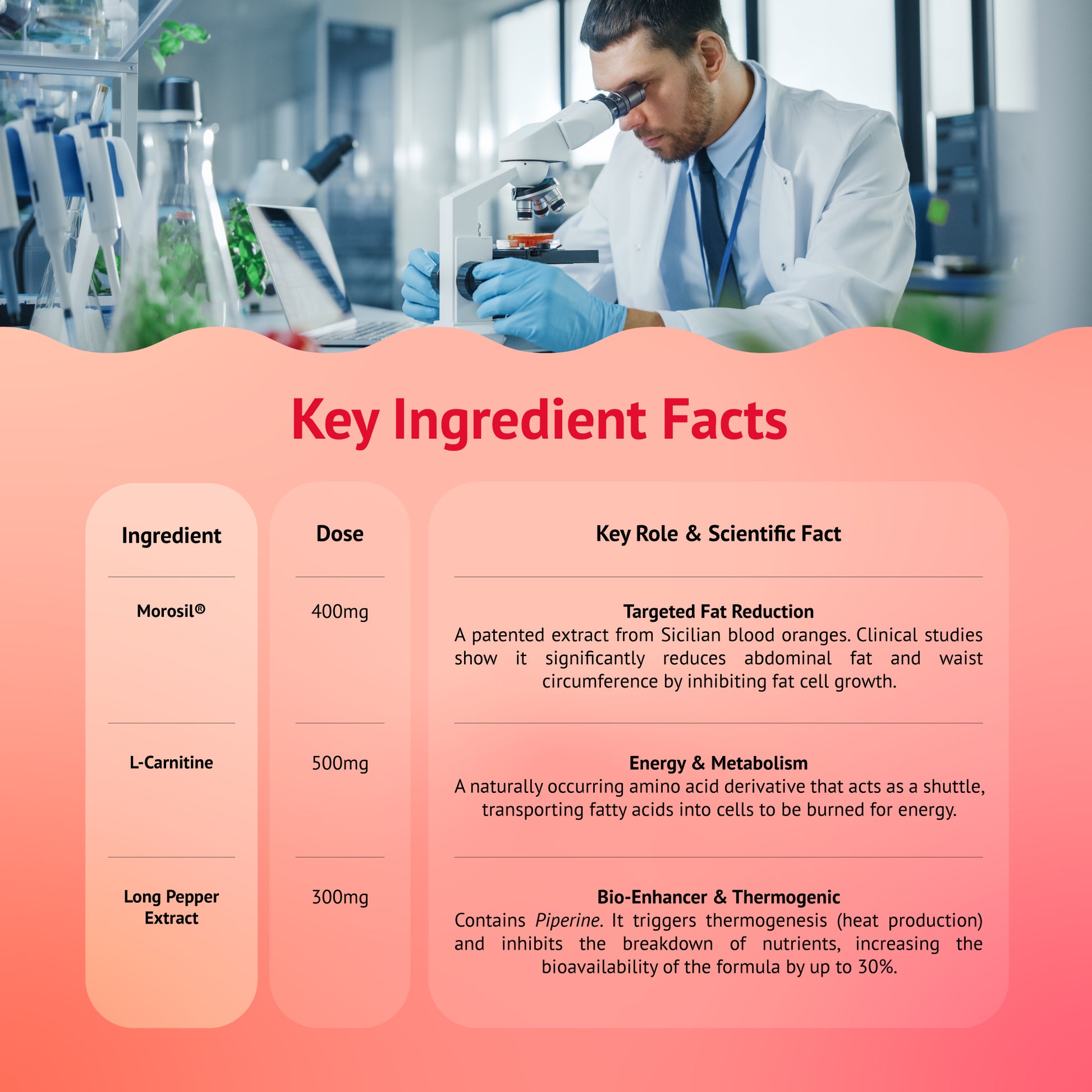 | Morosil® | Targeted Fat Reduction A patented extract from Sicilian blood oranges. Clinical studies show it significantly reduces abdominal fat and waist circumference by inhibiting fat cell growth. | 400mg |