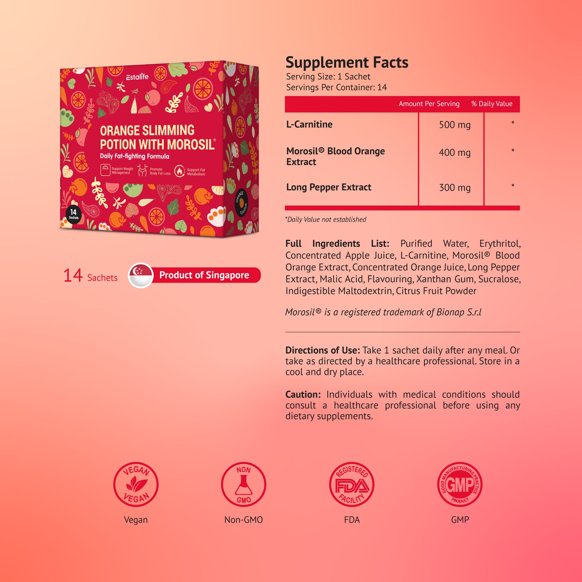 Full Ingredients List: Purified Water, Erythritol, Concentrated Apple Juice, L-Carnitine, Morosil® Blood Orange Extract, Concentrated Orange Juice, Long Pepper Extract, Malic Acid, Flavouring, Xanthan Gum, Sucralose, Indigestible Maltodextrin, Citrus Fruit Powder