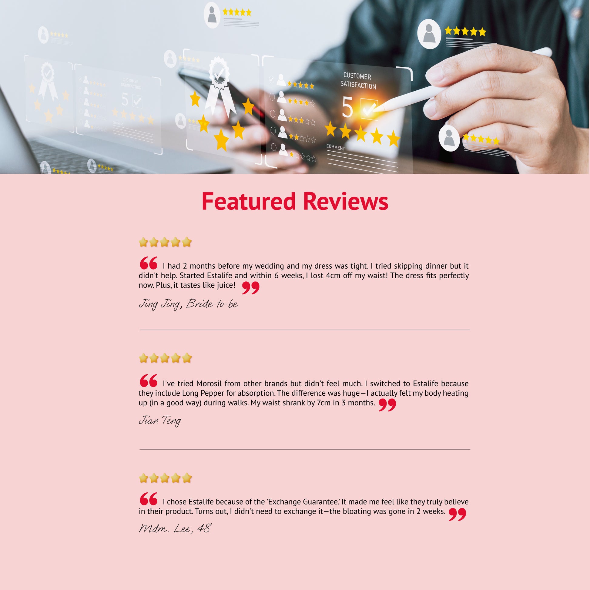"I chose Estalife because of the 'Exchange Guarantee.' It made me feel like they truly believe in their product. Turns out, I didn't need to exchange it—the bloating was gone in 2 weeks."