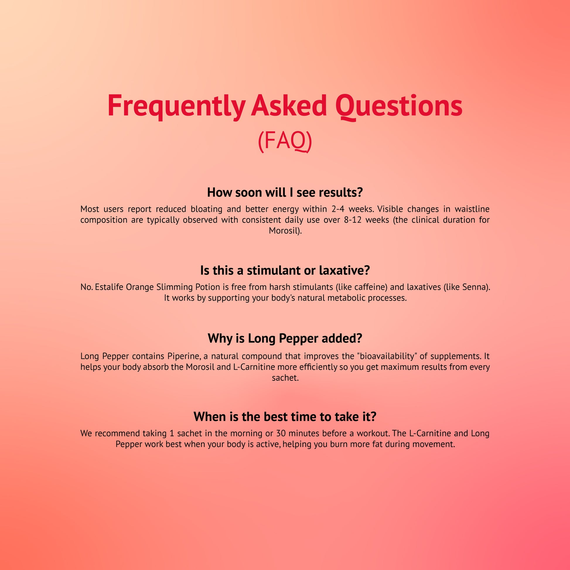 Long Pepper contains Piperine, a natural compound that improves the "bioavailability" of supplements. It helps your body absorb the Morosil and L-Carnitine more efficiently so you get maximum results from every sachet.