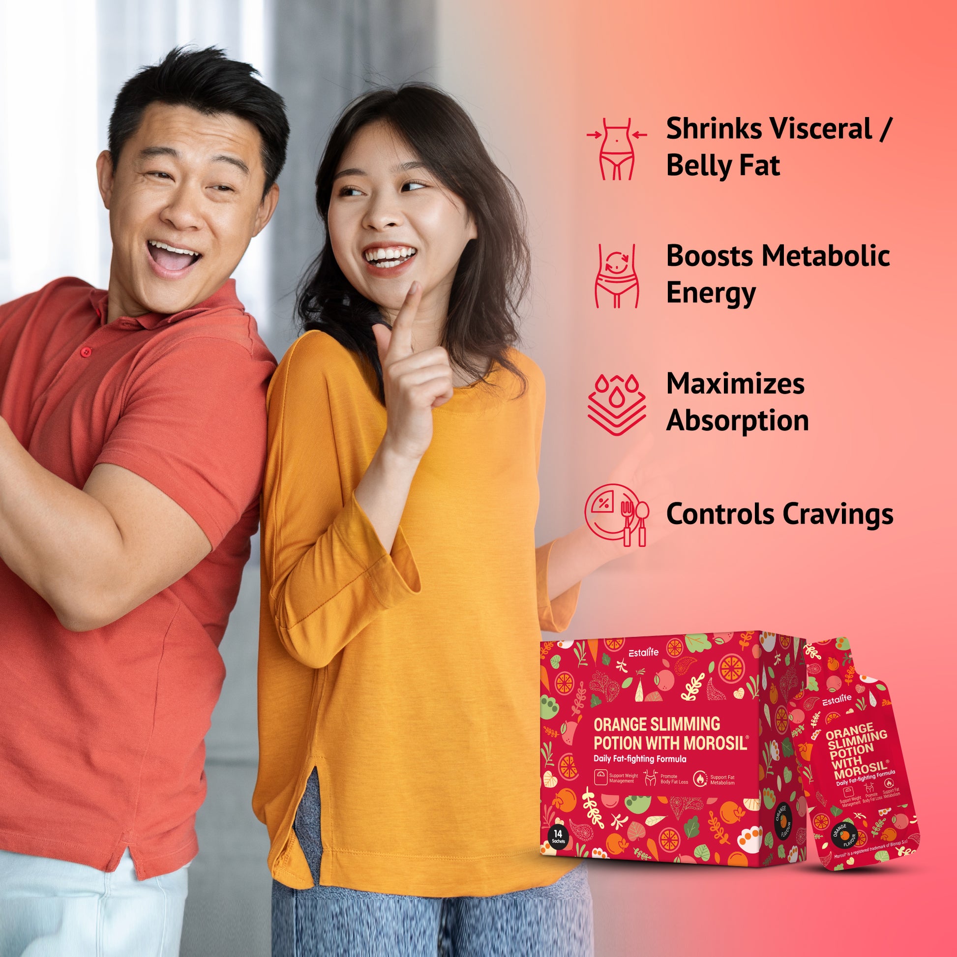 1. 腰围和脂肪代谢支持: Morosil® 血橙提取物富含花青素和多种维生素,是柑橘类活性成分。经科学研究证实,它有助于促进脂肪代谢,尤其对腹部脂肪代谢效果显著。每日坚持使用,有助于维持健康的身体成分。